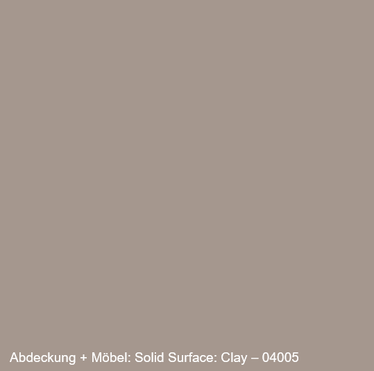 Ausführung Abdeckung Solid Surface Clay - 04005, Fronten Solid Surface Clay Ripple - 04003, Aussenseiten Edelmattlaminat Kaschmir - K001, Schubladenfarbe innen weiss, 2 Türen Rundfront, Schublade 570 x 360mm