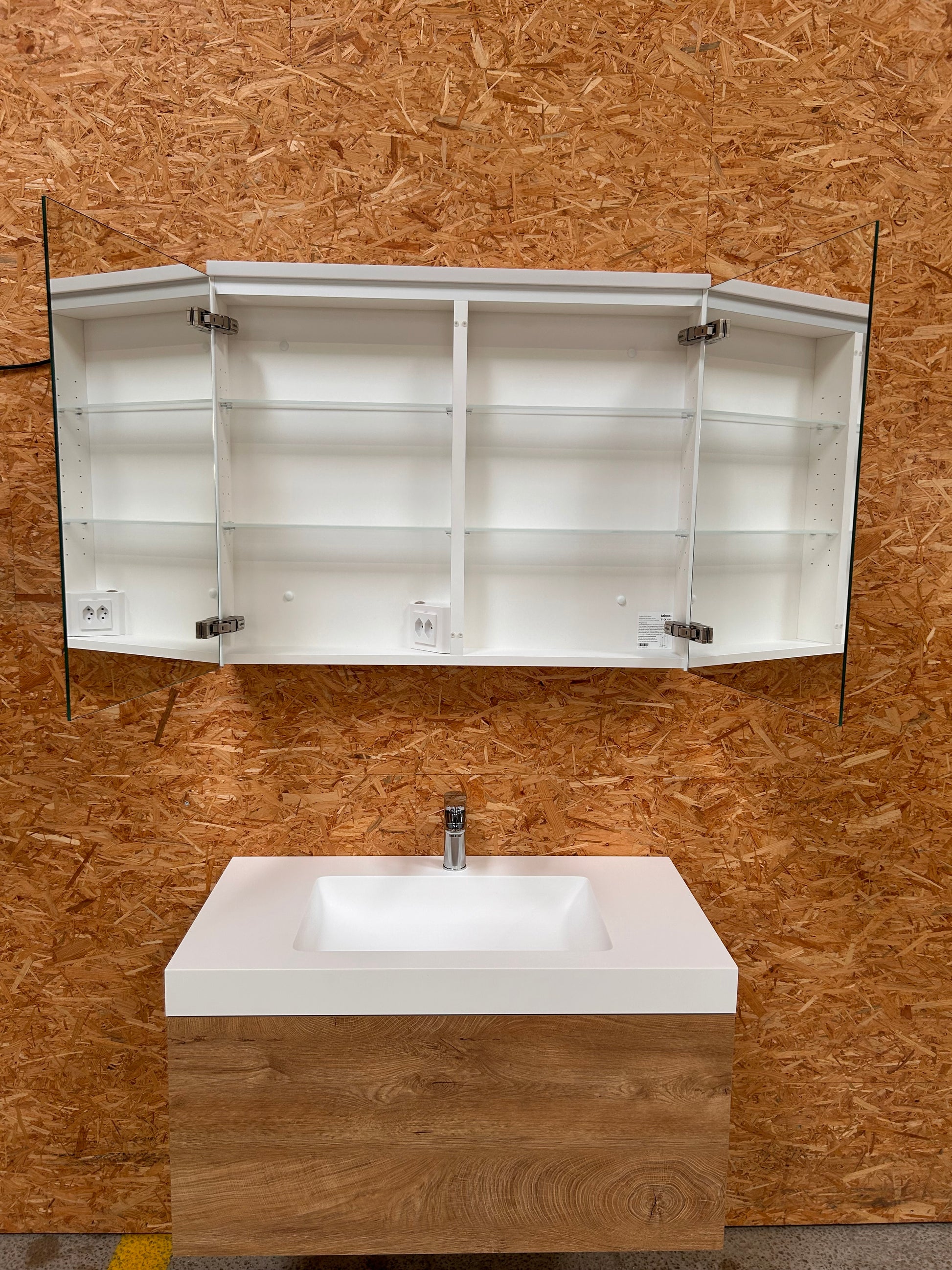 Ausführung Leuchte LED comfort, 2700-5000 Kelvin (tunable white), Beleuchtung dimmbar (TW+/AppControl) mit zwei integrierten Tastern (EIN/AUS/DIM/Farbe), extern gesteuert über einen Doppeltaster (EIN/AUS/DIM/Farbe) der Hausinstallation, digital mit individueller Tageszeitsteuerung via App, Aussenseiten und Korpus Kunstharzlaminat Glacier White - A001, 2 Doppelspiegeltüren, 4 Glastablare, in linkem Bereich Doppelsteckdose mit zwei Tastern unten rechts