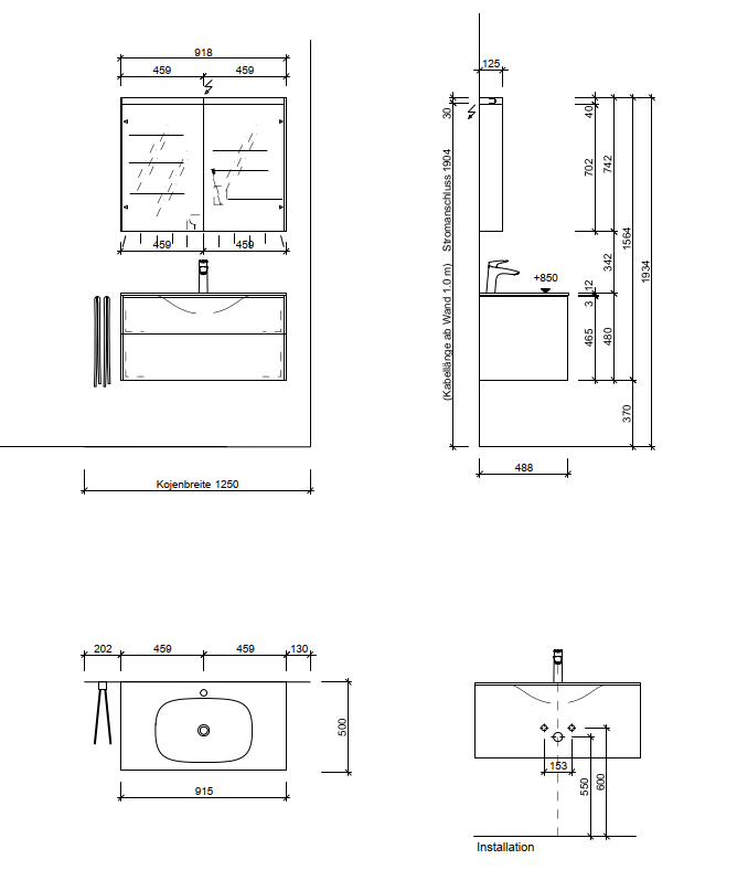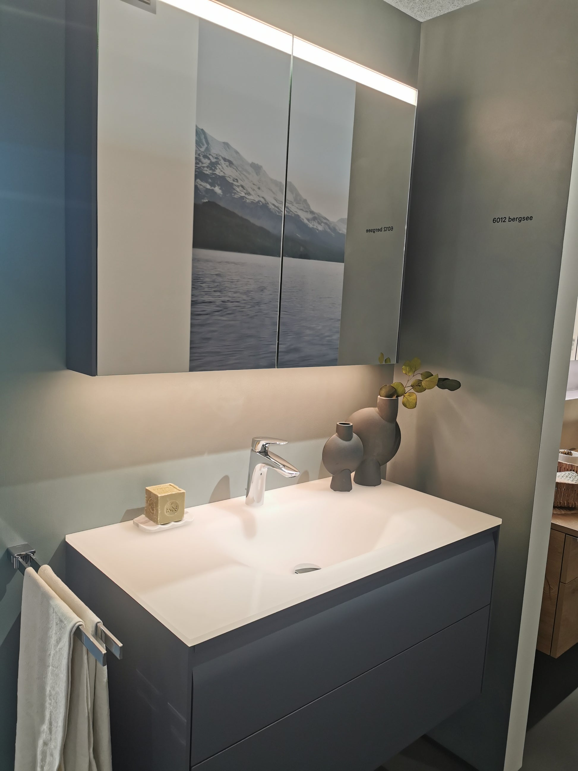 Ausführung Aussenseite Pulverlack Graublau - K009, 2 Doppelspiegeltüren, 5 Glastablare, 1 Zahnglastablar, Doppelsteckdose im ersten Bereich unten rechts, Leuchte LED comfort, 2700-6500 Kelvin (tunable white), Beleuchtung dimmbar (TW) mit zwei integrierten Tastern (EIN/AUS/DIM/Farbe), extern gesteuert über einen Schalter (EIN/AUS) der Hausinstallation