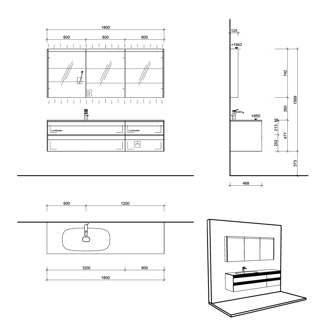 Achsmass Becken von links nach rechts 600 / 1200mm