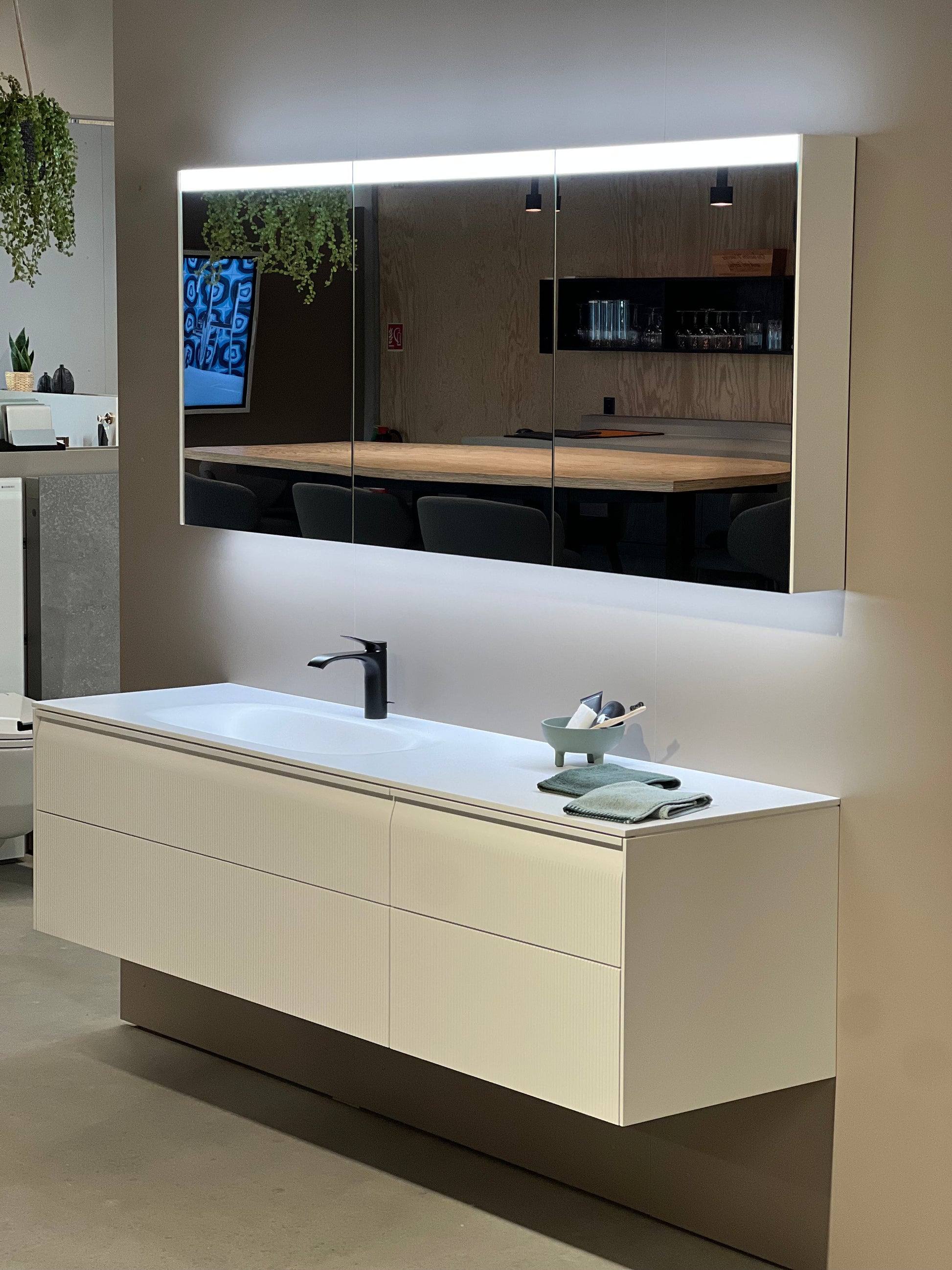Ausführung Aussenseite Pulverlack Gletscherweiss - K004, 3 Doppelspiegeltüren, 5 Glastablare, 1 Zahnglastablar, Leuchte LED comfort, indirektes Licht nach unten, 2700-5000 Kelvin (tunable white), Beleuchtung dimmbar (TW), mit zwei integrierten Tastern (EIN/AUS/DIM/Farbe) extern gesteuert über einen Schalter (EIN/AUS) der Hausinstallation