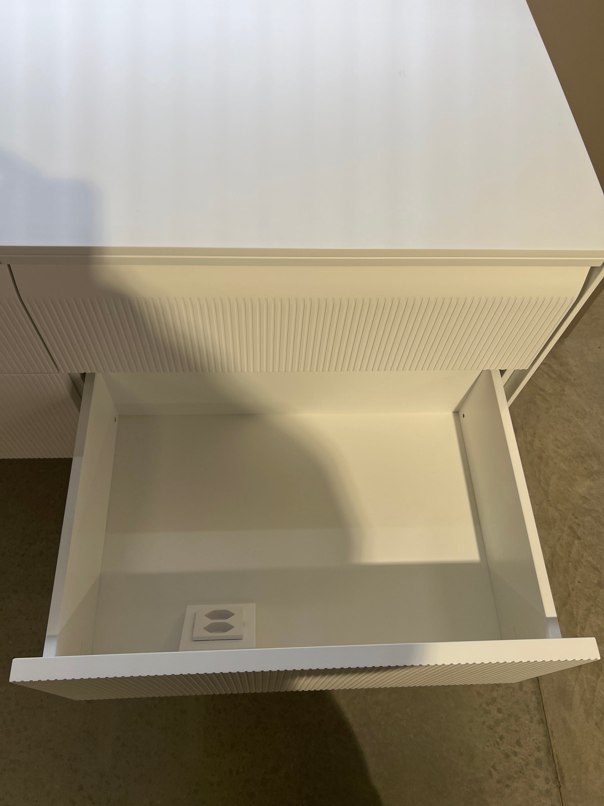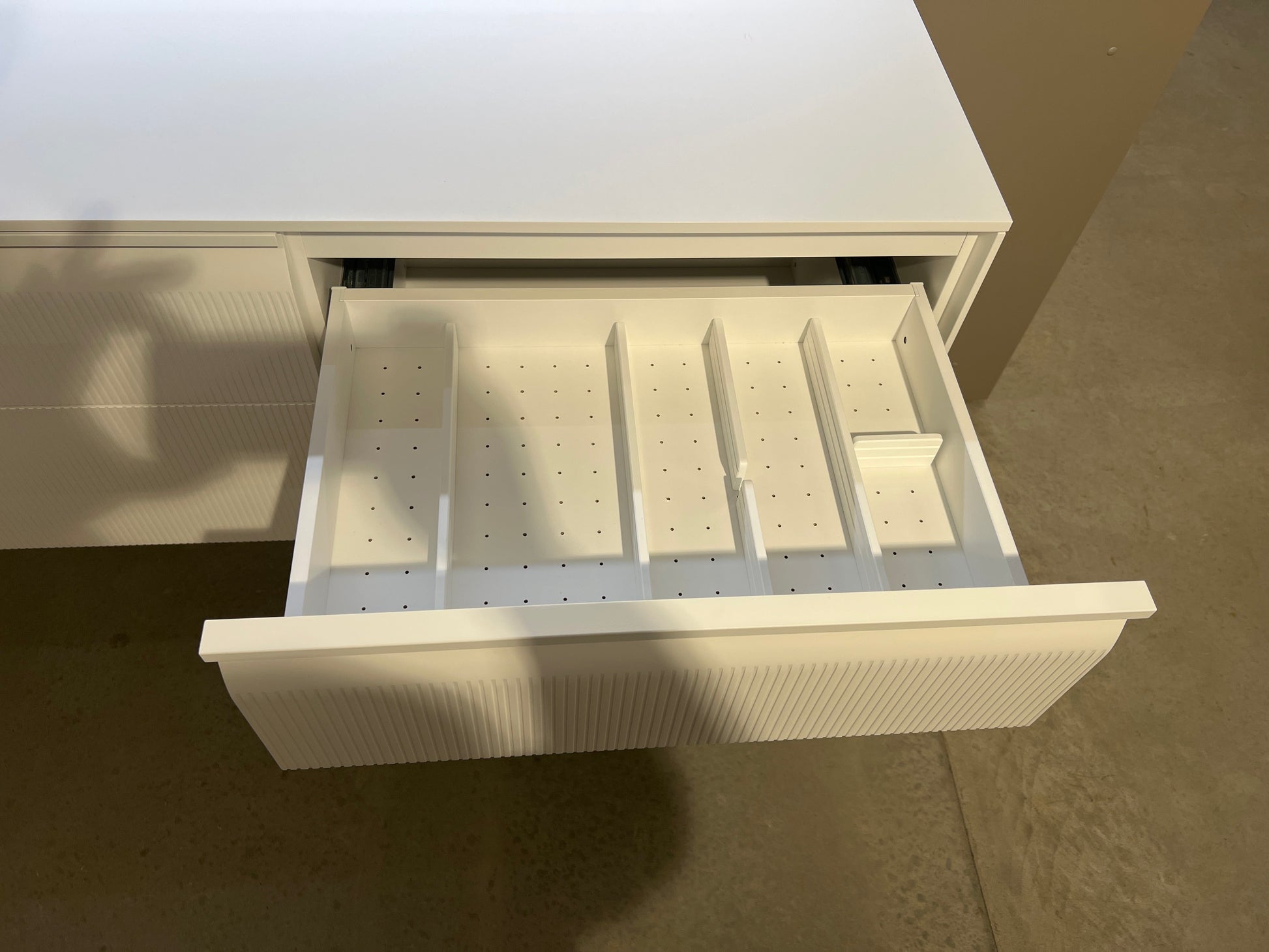 Ausführung Fronten Pulverlack Gletscherweiss Stripes - K010, Aussenseiten Pulverlack Gletscherweiss - K004, 4 Schubladen, Schubladen oben mit Griffleiste mellow, Schubladen unten grifflos TipOn Blumotion, Schubladeneinteilung, eingebaute Steckdose im zweiten Bereich vorne links