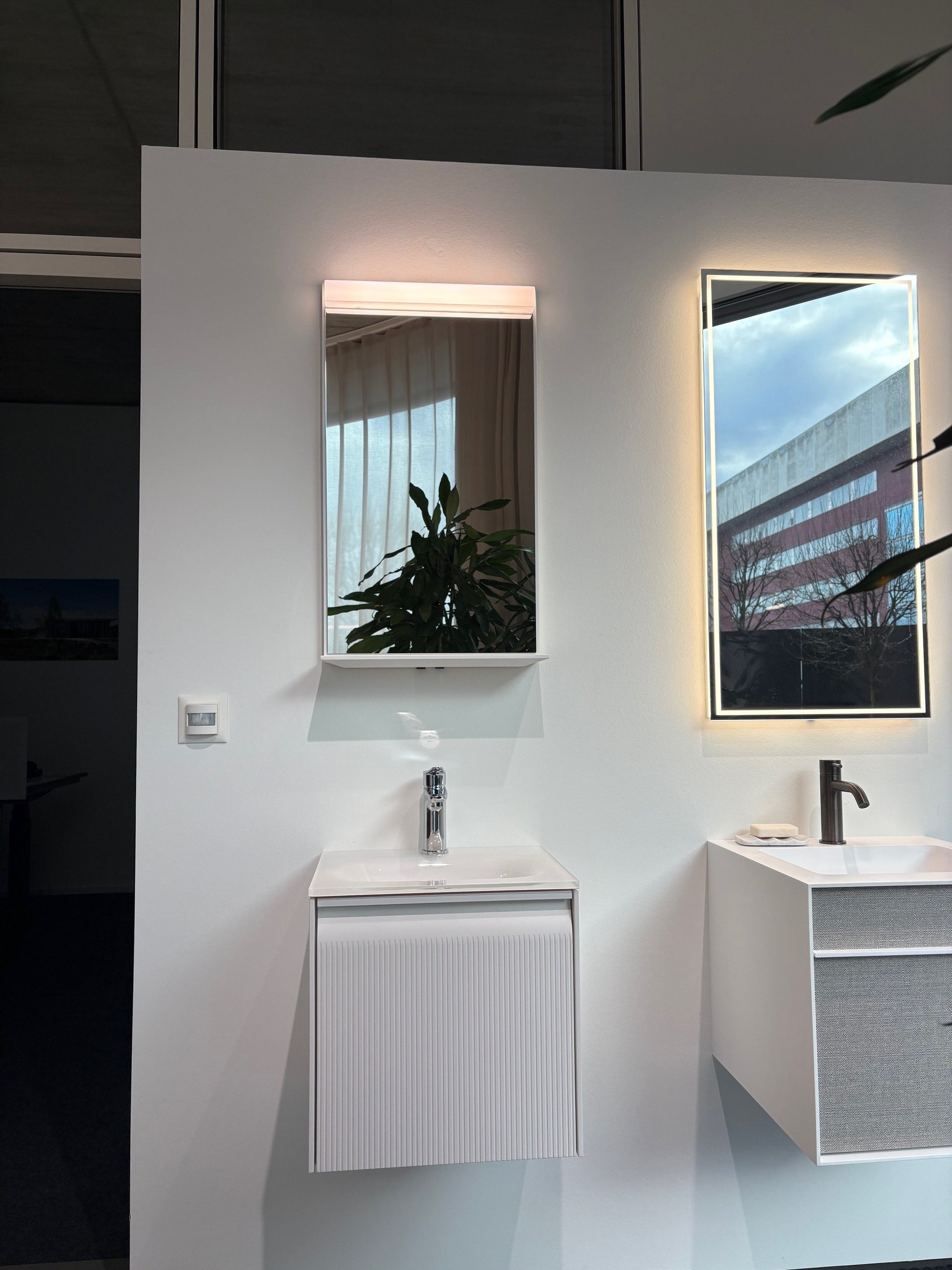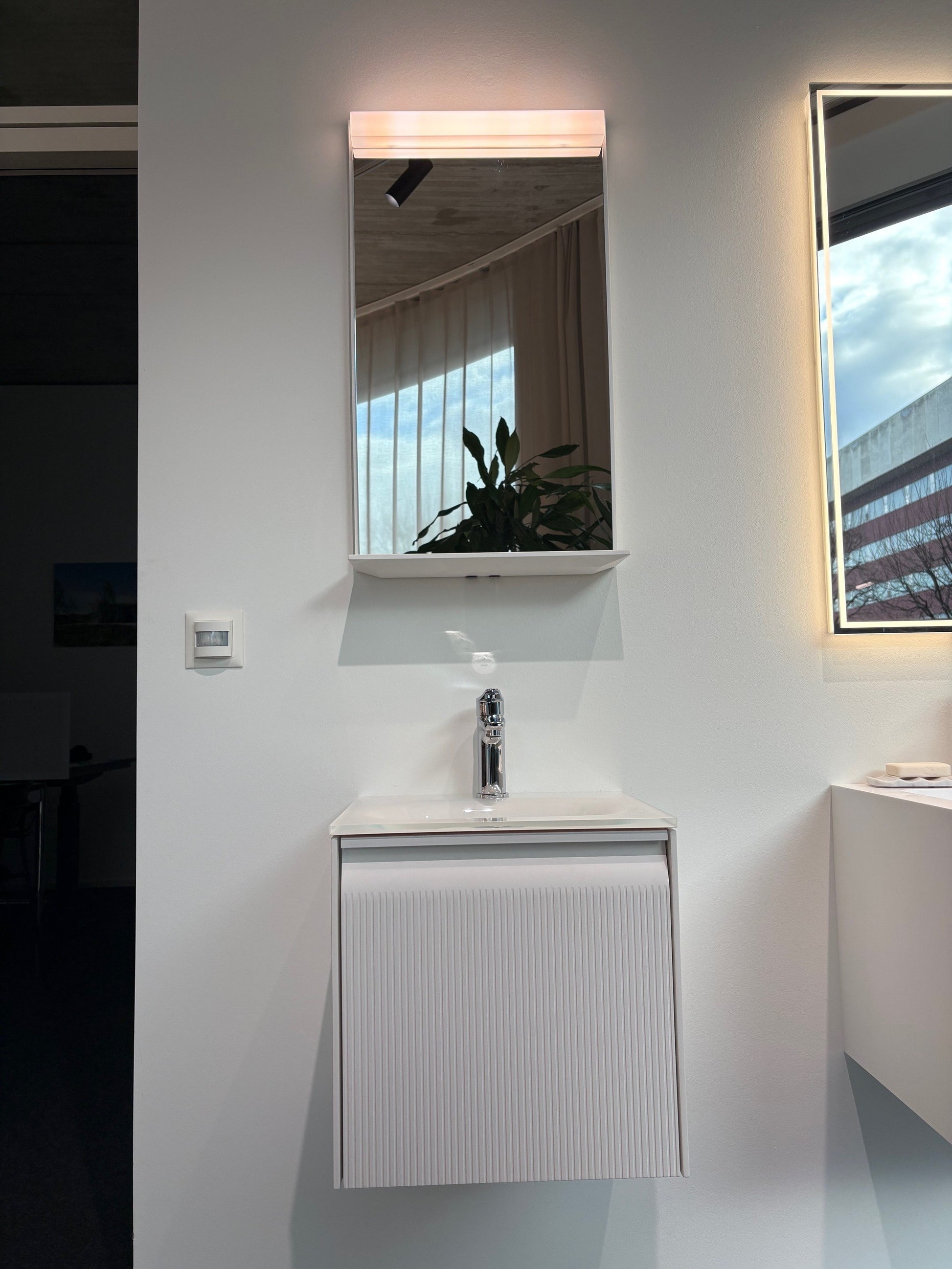 Ausführung Floatglasspiegel auf Trägerplatte, Pulverlack Gletscherweiss- K004, Leuchte oben aufgesetzt, 2700-6500 Kelvin (tunable white), Beleuchtung dimmbar (TW), mit zwei integrierten Tastern (EIN/AUS/DIM/Farbe), extern gesteuert über einen Doppeltaster (EIN/AUS/DIM/Farbe) der Hausinstallation