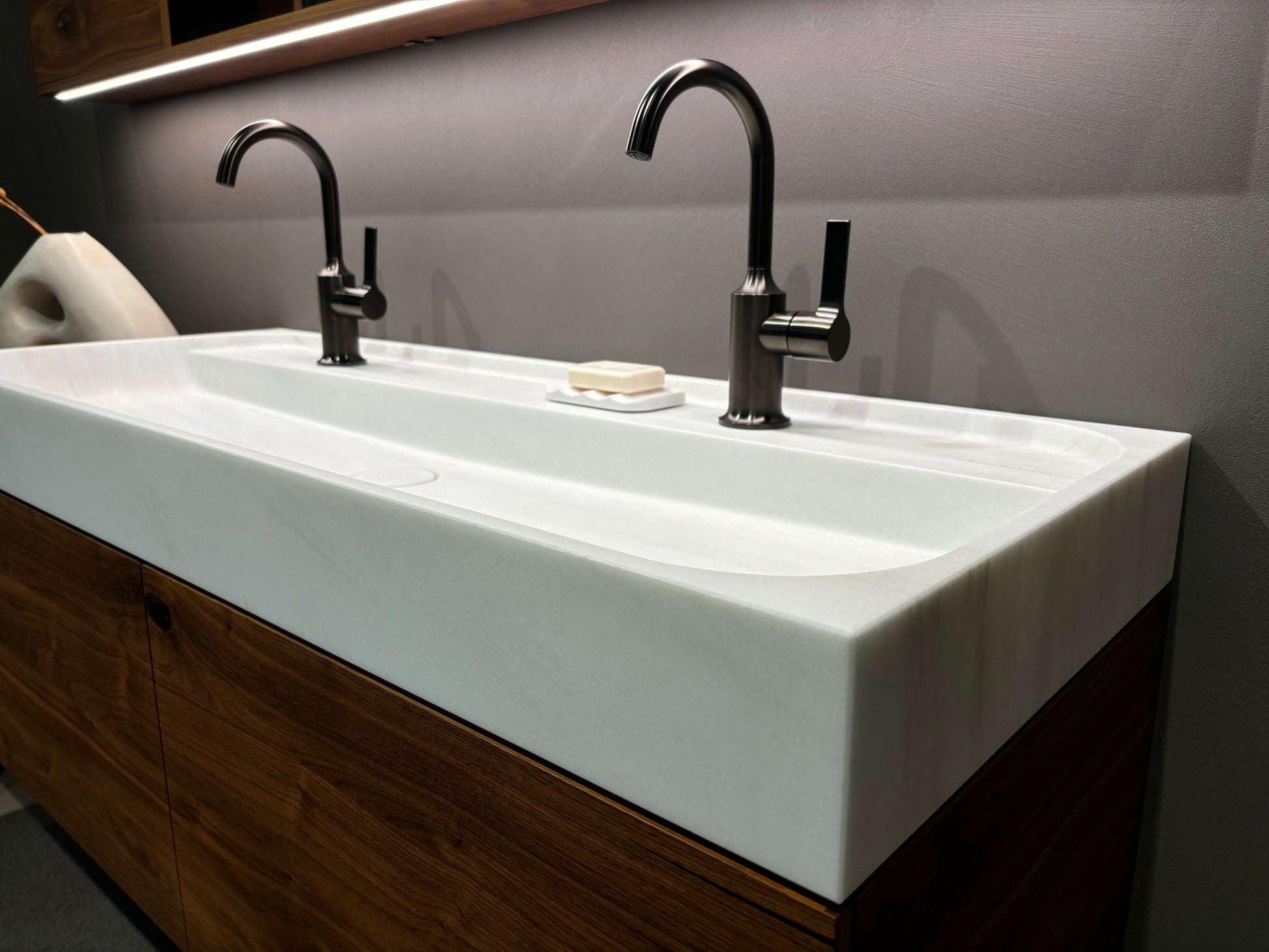 Waschtisch Aufsatzwaschtisch source120, Marmor Lasa Venato Vena d'Oro, Oberfläche geschliffen matt und imprägniert, 1200 x 460, Höhe 110, für 2 Armaturen mit Hahnlochbank, ohne Überlauf, mit integriertem Ablaufventil mit Haube in Marmor, Montagehinweis: ein Aufsatzwaschtisch source120 wiegt ca. 80kg, bitte stellen Sie sicher, dass die Wandbeschaffenheit ausreichend ist und dieses Gewicht tragen kann