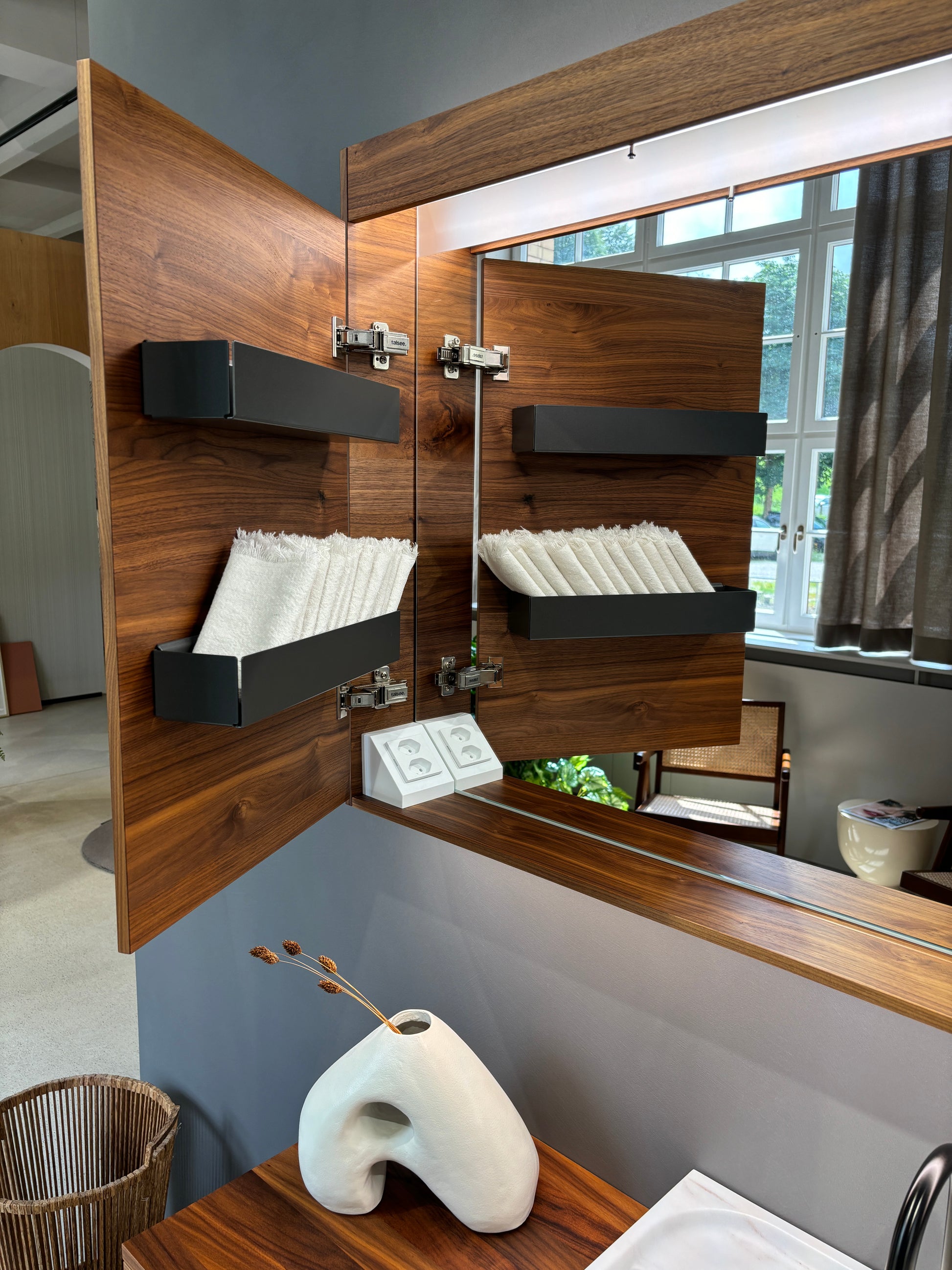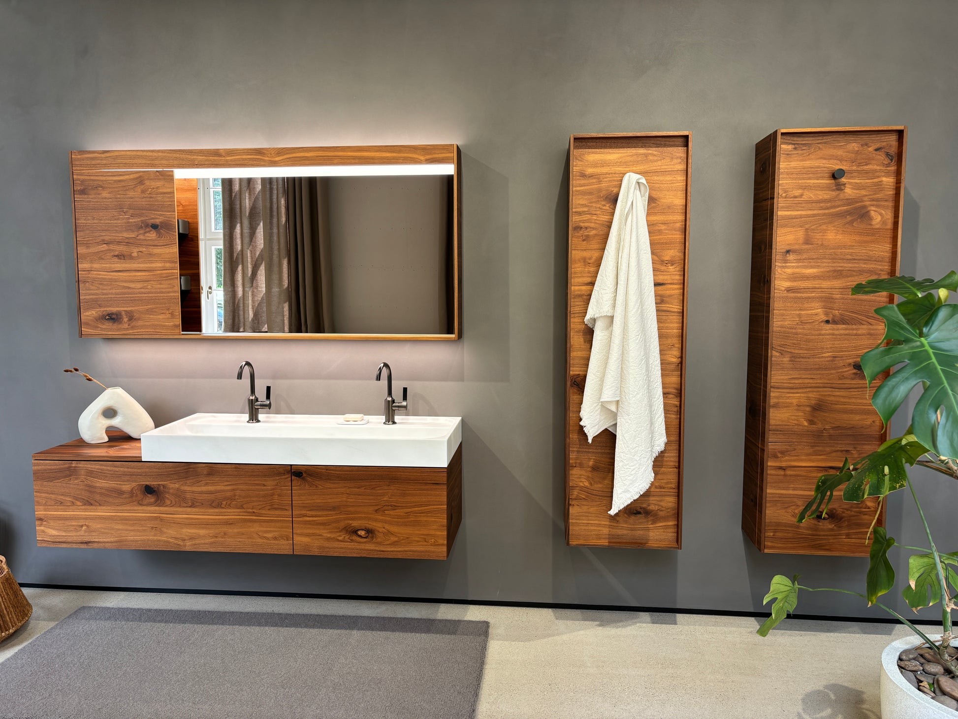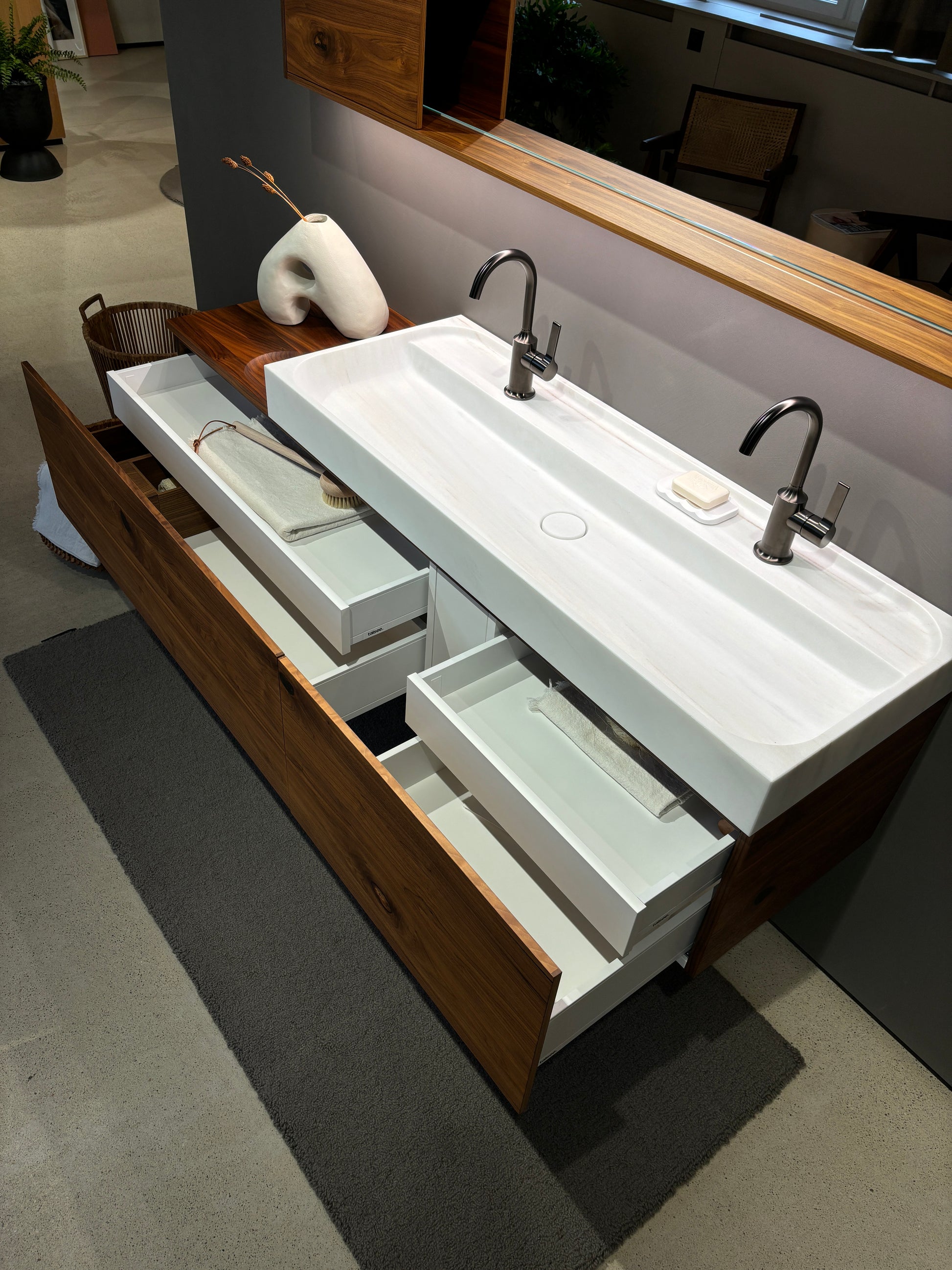 Ausführung Echtholz Manufaktur Forest Nut, gebürstet naturmatt lackiert - G004, Schubladenfarbe innen Weiss, Grifflos TipOn Blumotion, Möbelelemente 1. Bereich: Breite 1050mm, Höhe 350mm, Schublade mit Innenschublade, Schubladeneinteilung Cubibox Echtholzfurnier Nussbaum 3x, Deckel zu CubiWood 100/150, Nussbaum / 2. Bereich: Breite 600mm, CH-Doppelsteckdose eingebaut in Unterbau vorne rechts, Schublade Höhe 350mm für Innenschublade, Schmuckablage mit runder Vertiefung, 450x460mm, Echtholz Manufaktur Forest Nut, gebürstet naturmatt lackiert - G001