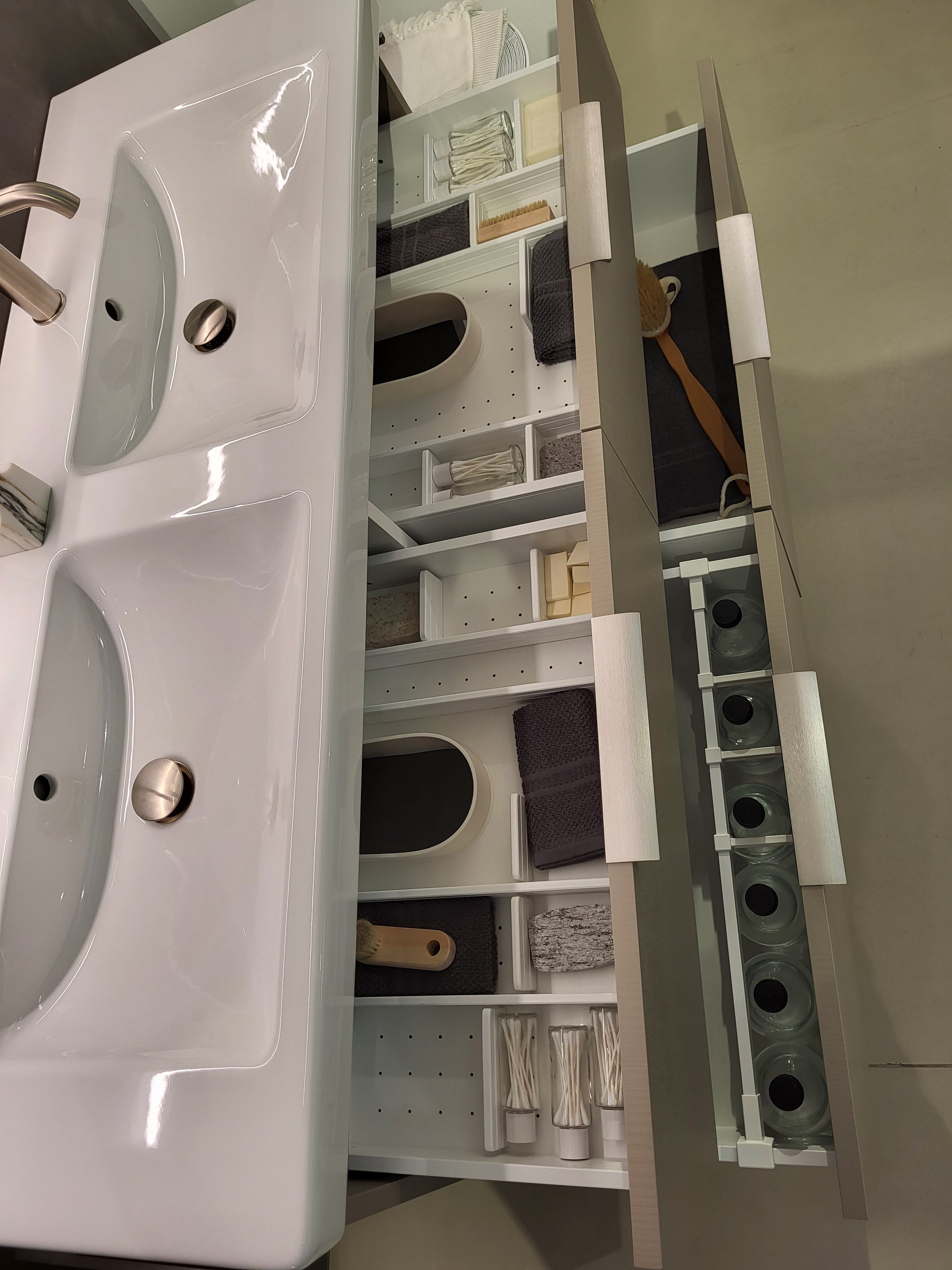 Inneneinteilung 2 Schubladen mit gelochtem Schubladenboden und Einteilung, 1 Schublade mit Schubladenteiler Legrabox und Querteilern