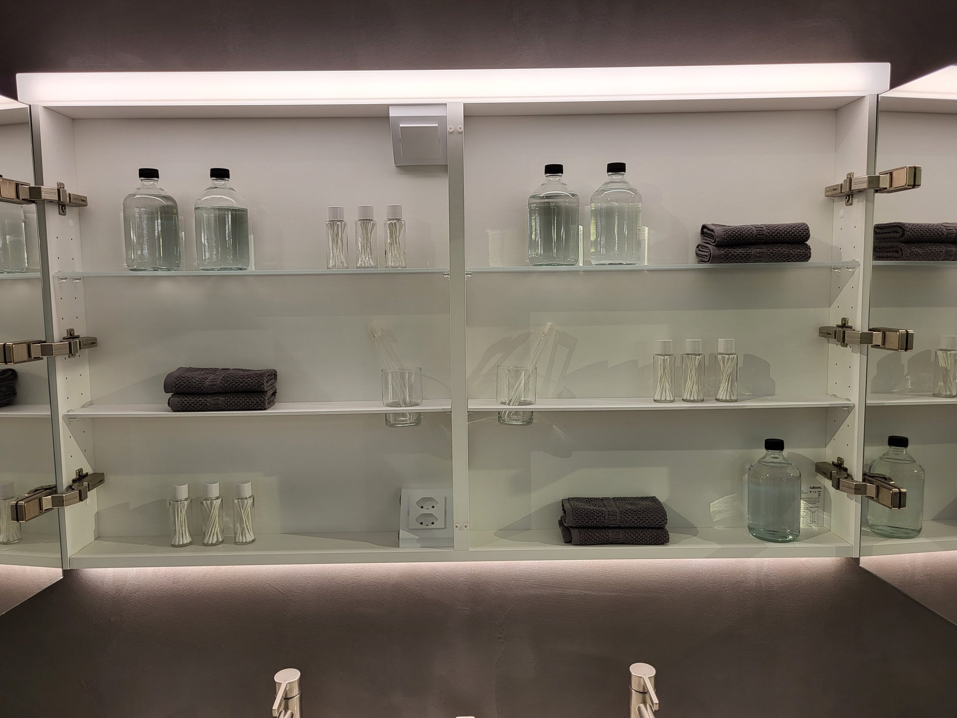 Ausführung Leuchte LED comfort, indirektes Licht nach unten, eingenutet in Korpusboden, 4000 Kelvin, Leuchte und indirektes Licht dimmbar (Touch-DIM) mit zwei integrierten Tastern (EIN/AUS/DIM), Aussenseiten Kunstharzlaminat Glacier White, 2 Doppelspiegeltüren, 2 Glastablare, 2 Zahnglas-Tablare Compact-Laminat, Doppelsteckdose in linkem Teil unten rechts mit Doppeltaster