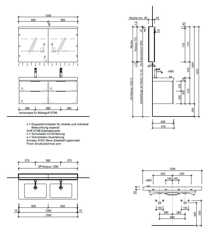 Ausführung Möbel Strukturlaminat Zinn - A010, 4 Schubladen, Möbelgriff GT96 edelstahloptik