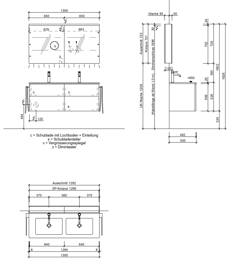 Inneneinteilung 2 Schubladen mit gelochtem Schubladenboden und Schubladeneinteilung, eingebaute Steckdose im ersten Bereich unten links
