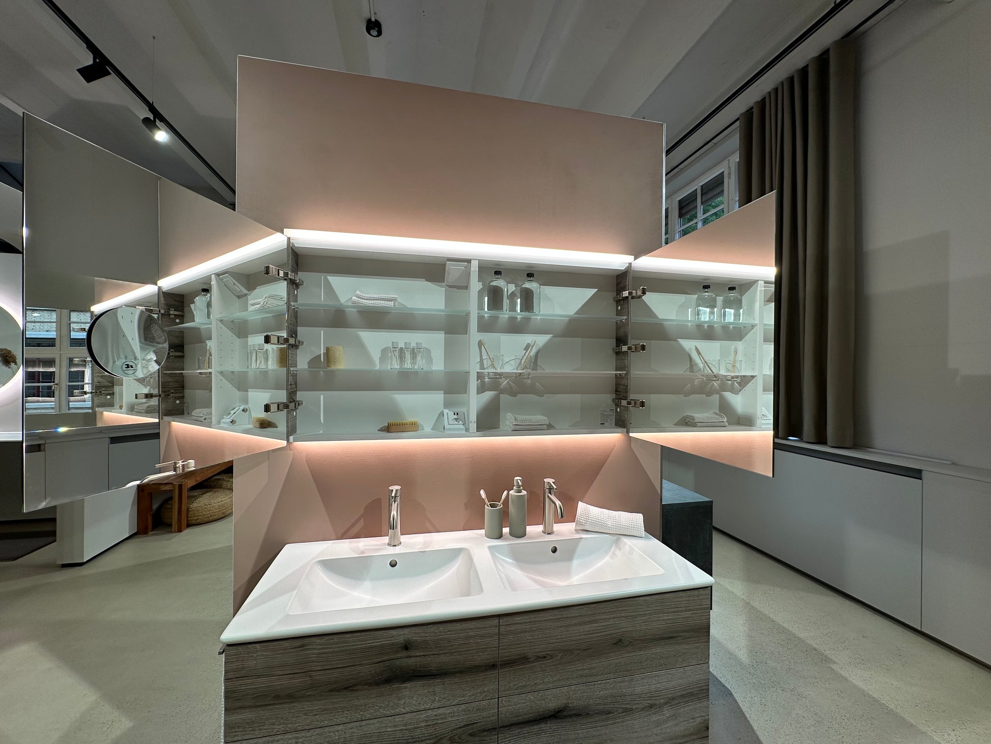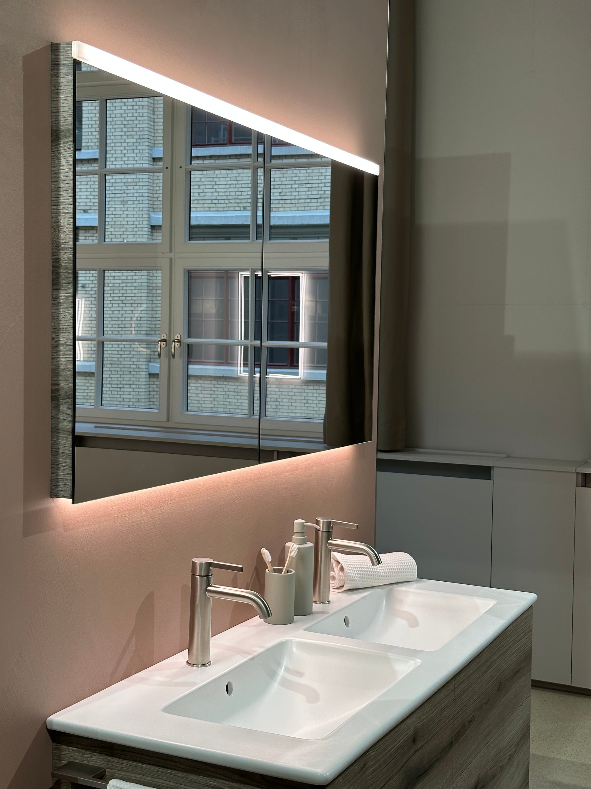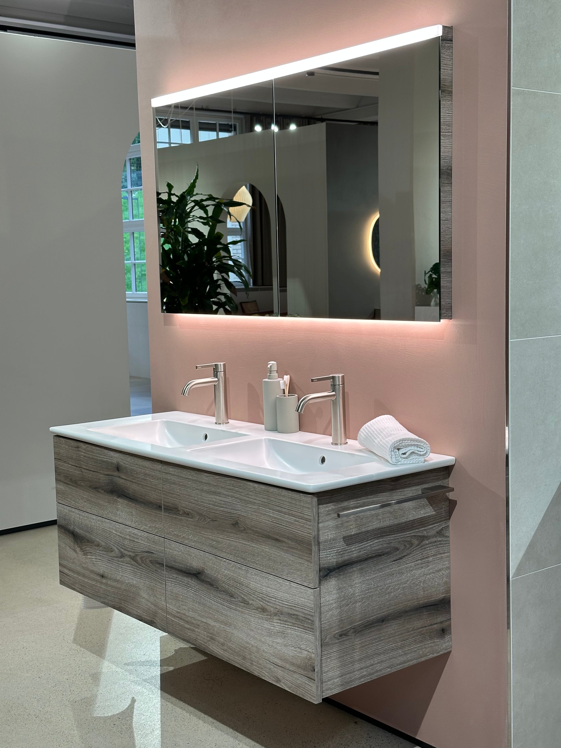Ausführung Leuchte LED comfort, indirektes Licht nach unten, 2700-6500 Kelvin (tunable white), Beleuchtung dimmbar TW) mit zwei integrierten Tastern (EIN/AUS/DIM/Farbe), extern gesteuert über einen Schalter (EIN/AUS) der Hausinstallation, Aussenseite Strukturlaminat Nordic Oak - A022, 2 Doppelspiegeltüren, 3 Glastablare, 1 Zahnglastablar Compact-Laminat, 1 Vergrösserungsspiegel