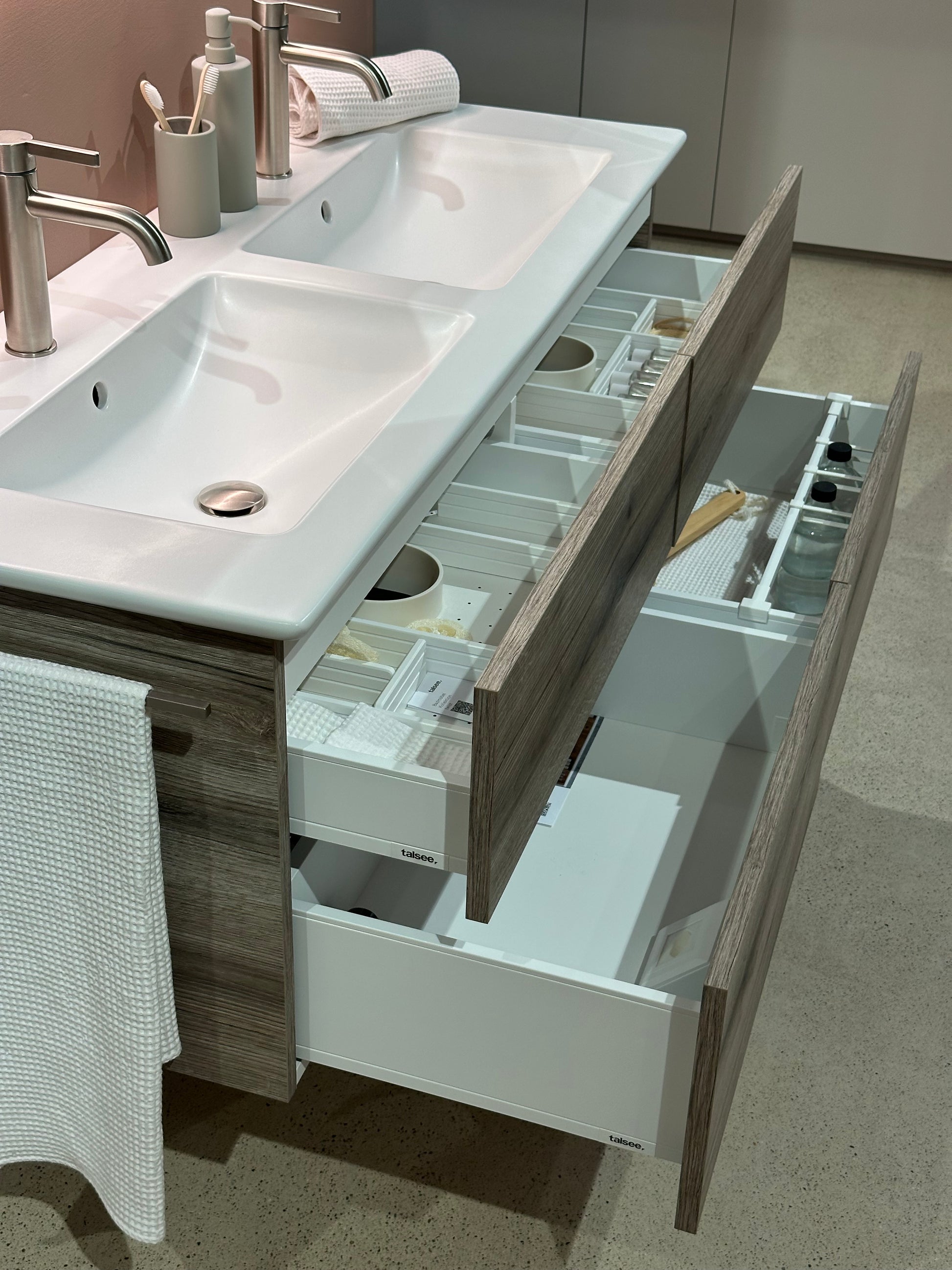 Ausführung Fronten und Aussenseite Strukturlaminat Nordic Oak - A022, 4 Schubladen, Seitengriff, Handtuchhalter square Edelstahloptik