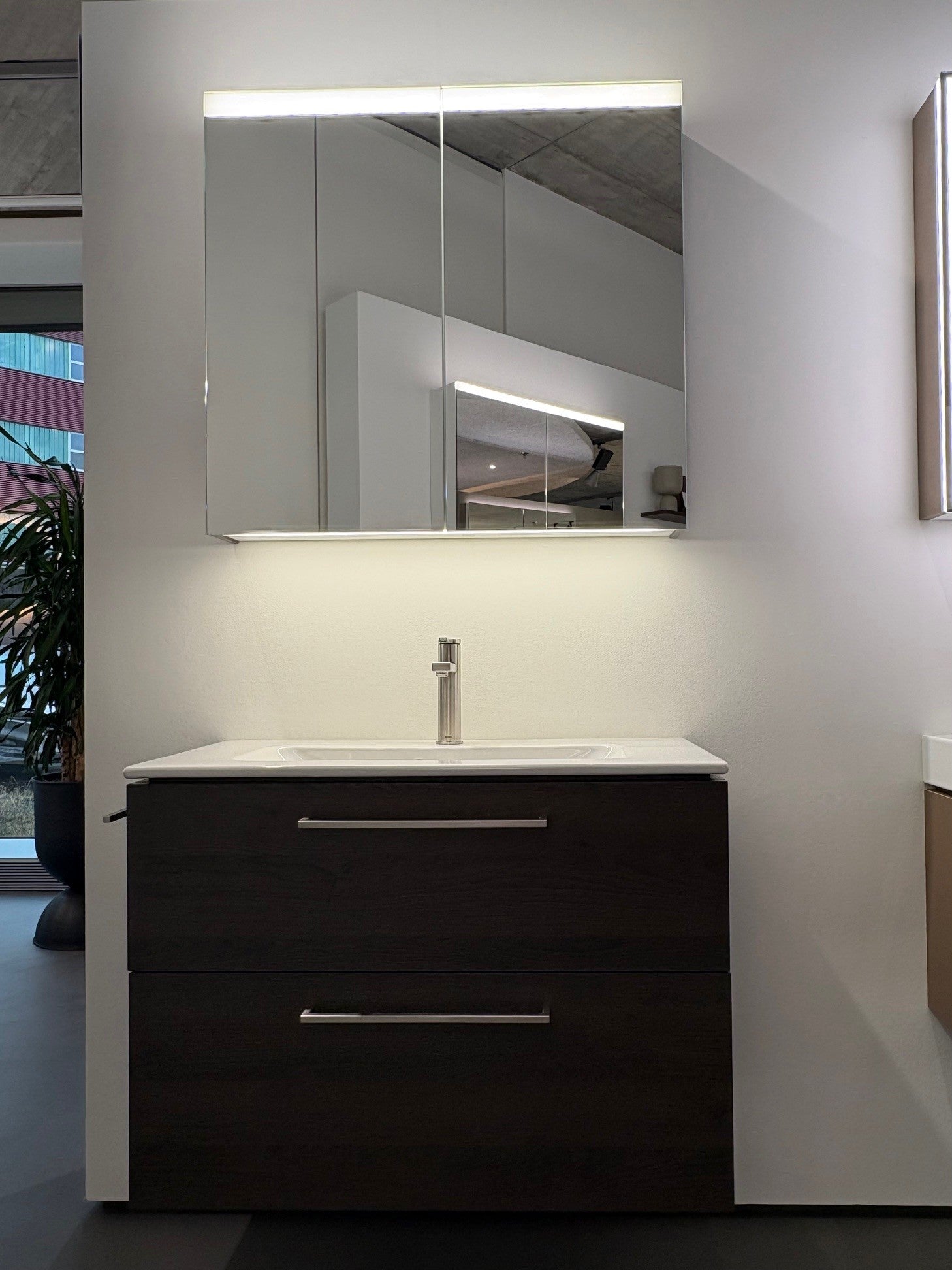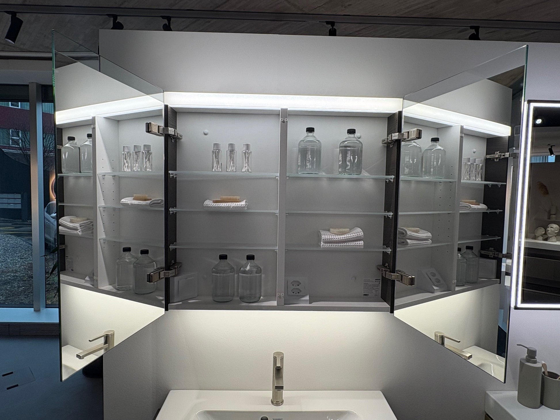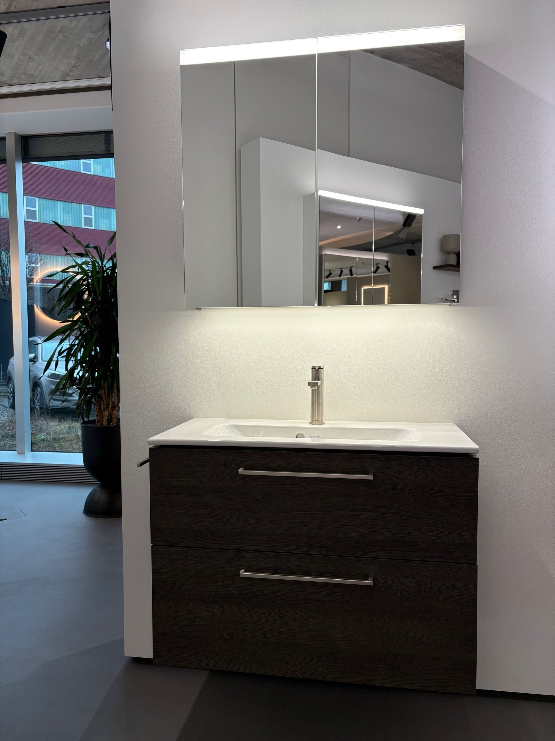 Ausführung Leuchte LED classic, indirektes Licht nach unten, 4000 Kelvin (kaltweiss), Beleuchtung dimmbar (Touch-IM(EVG)) mit integriertem Taster (EIN/AUS/DIM), extern gesteuert über einen Schalter (EIN/AUS) der Hausinstallation, Aussenseite Strukturlaminat Dark Oak - A018, Korpus Kunstharzlaminat Glacier White - A001, 2 Doppelspiegeltüren, 6 Glastablare, Doppelsteckdose mit Dimm-Taster im zweiten Bereich unten links