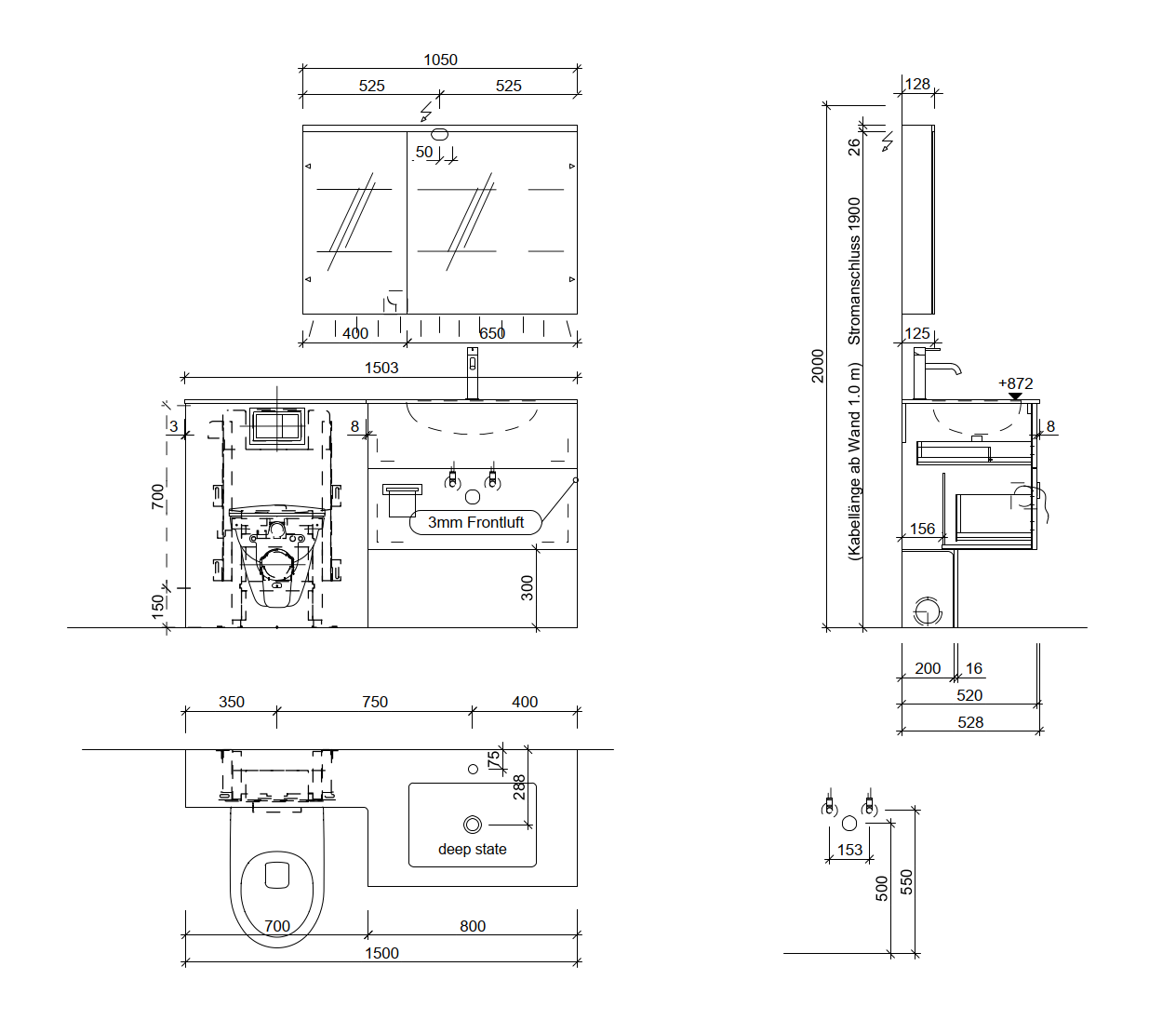 Mass 1500 x 872 x 528mm (BxHxT), Breite WC-Element 700mm