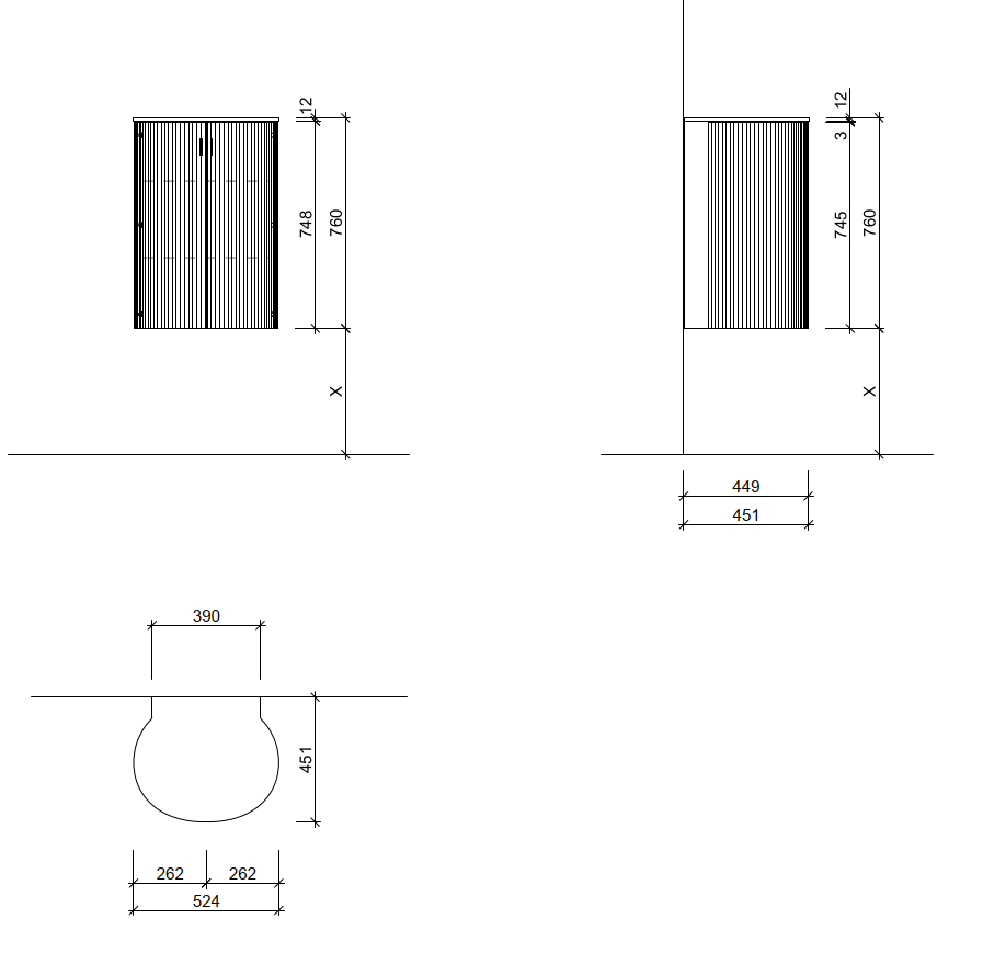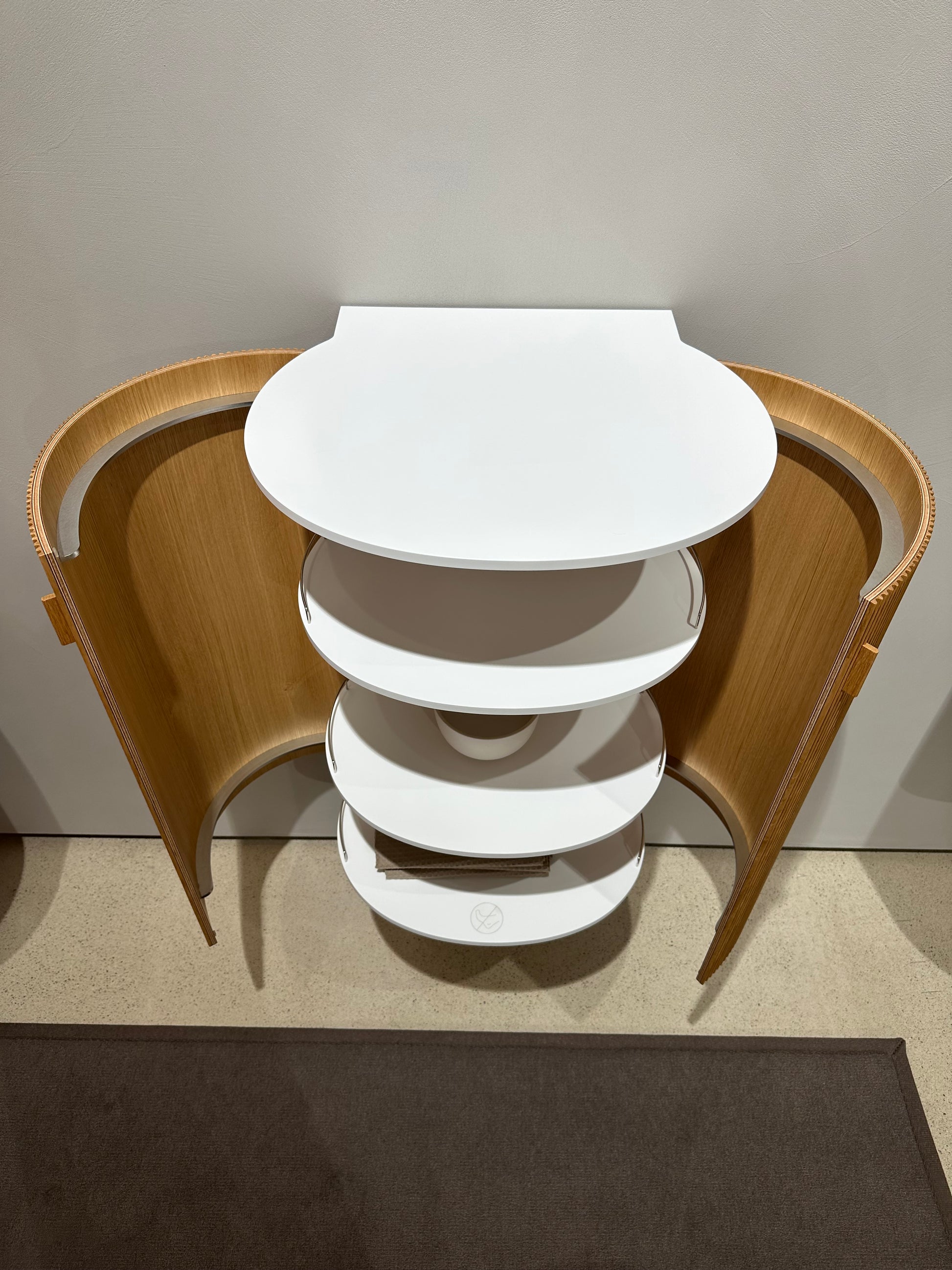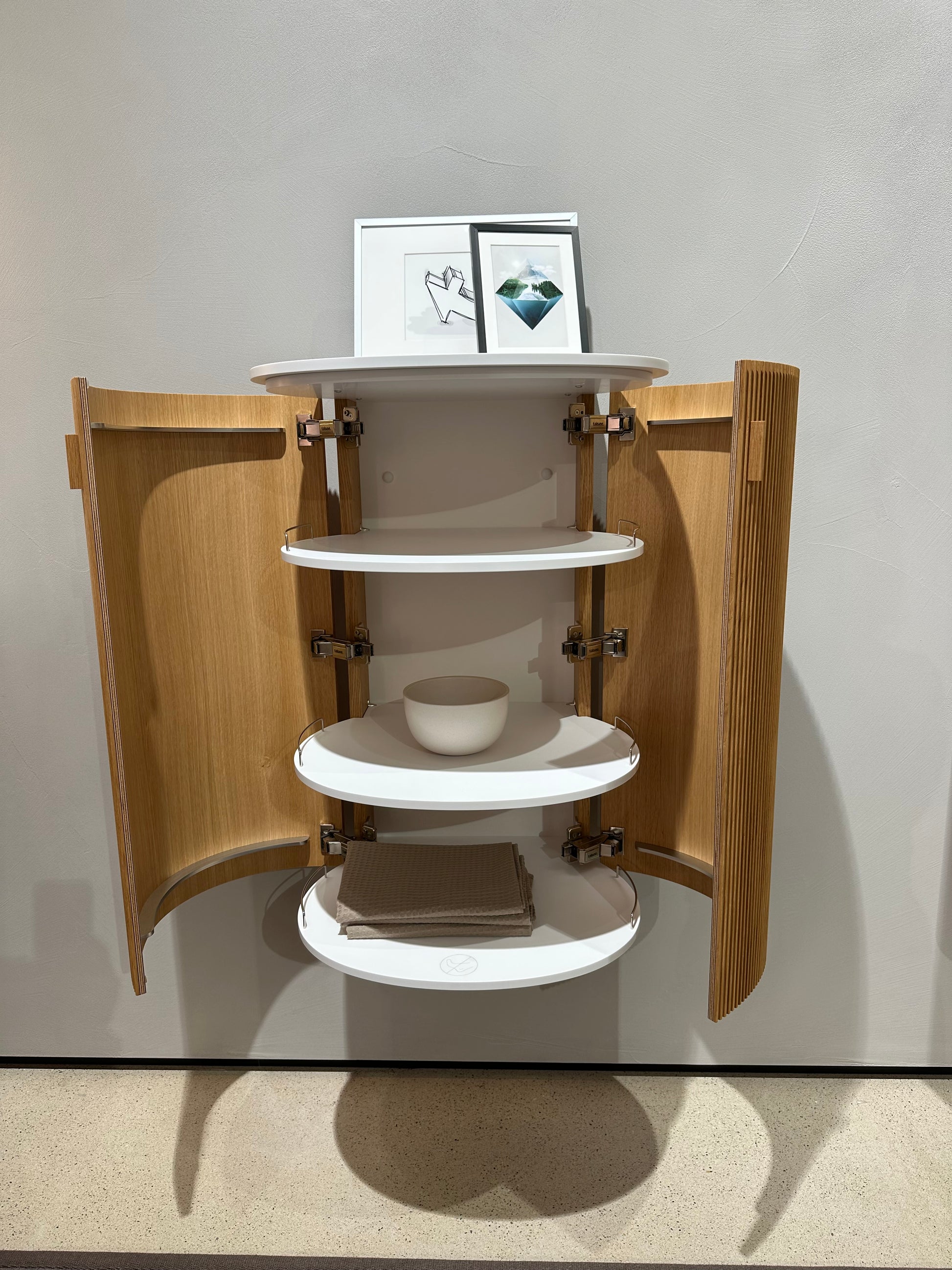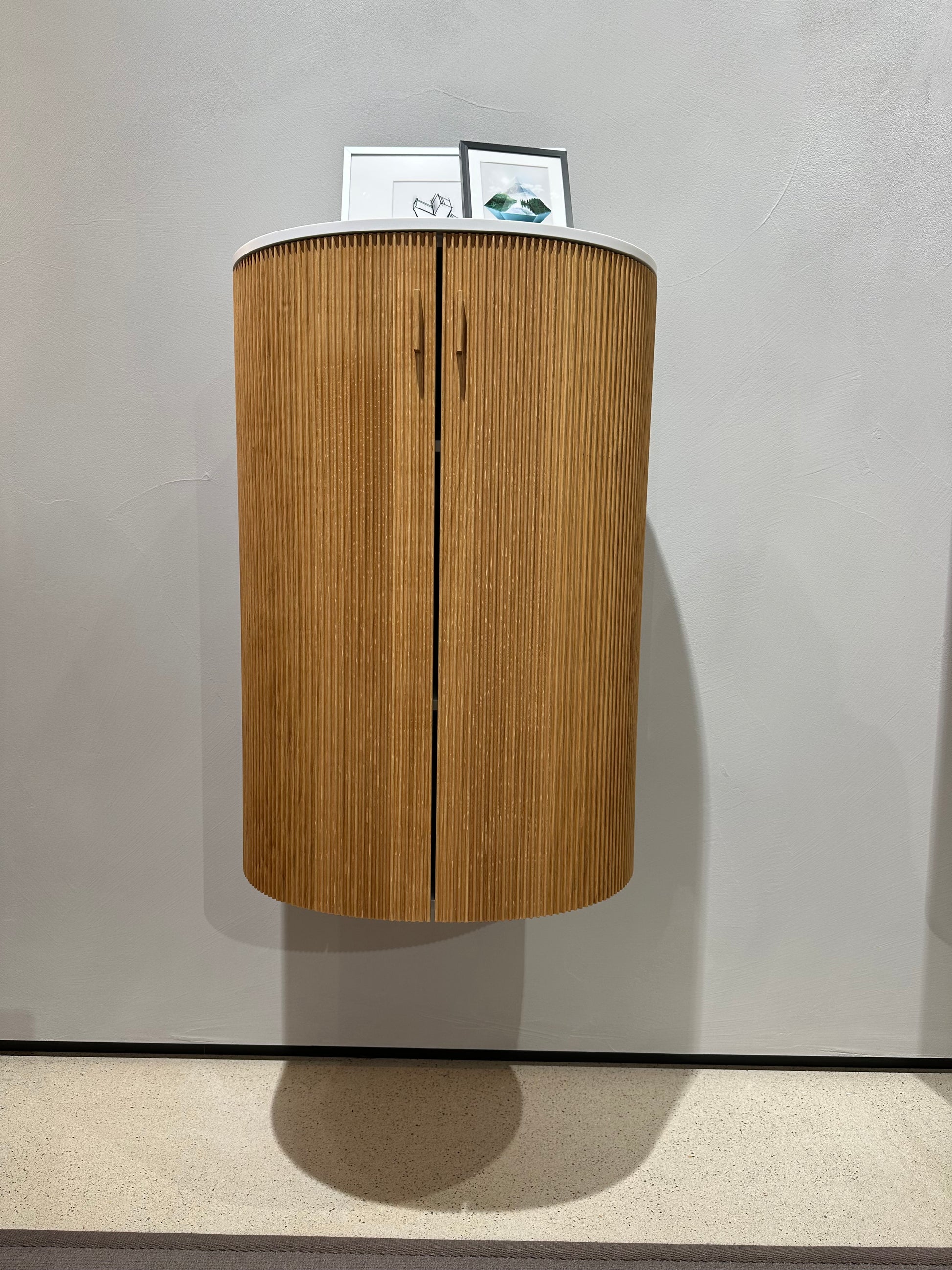 Ausführung Abdeckung Solid Surface Glacier White - 04004, Front Echtholz Relief Oak Ripple - G007, Aussenseiten Echtholzfurnier Eiche - C010, Doppeltüren, flow Griff, 2 Tablare