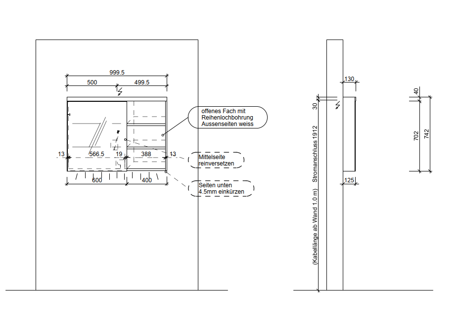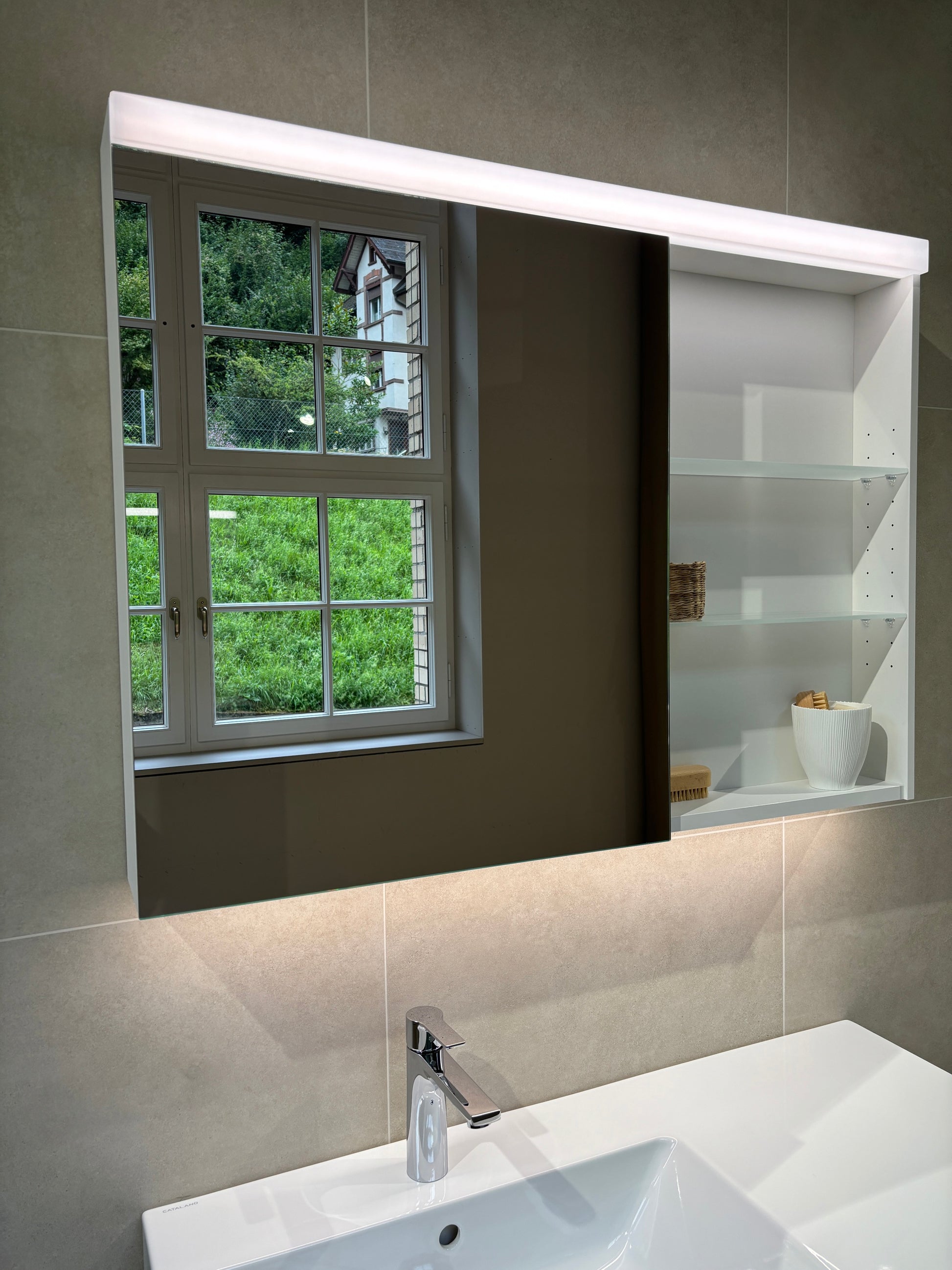 Ausführung LED comfort, indirektes Licht nach unten, 4000 Kelvin (kaltweiss), Beleuchtung dimmbar (Touch-DIM (EVG)) mit integriertem Taster (EIN/AUS/DIM), extern gesteuert über einen Schalter (EIN/AUS) der Hausinstallation, Aussenseiten Kunstharzlaminat Glacier White - A001, Doppelspiegeltüre Band links, 3 Glastablare, Zahnglastablar, Doppelsteckdose mit Dimm-Taster im ersten Bereich unten rechts