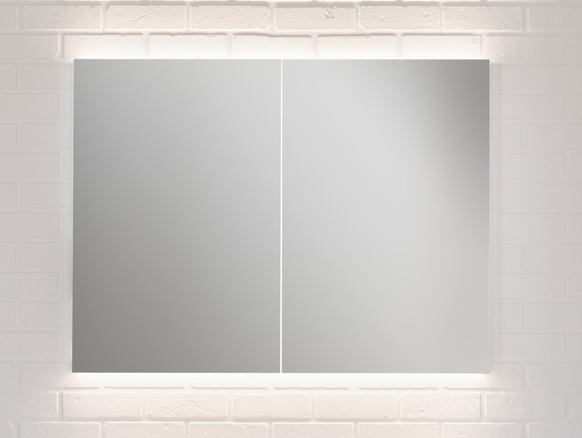 Ausführung Leuchte LED comfort, indirektes Licht nach oben und unten, inliegendes Reflektlicht mit Türkontaktschalter für blendfreie Gesichtsausleuchtung, 4000 Kelvin (kaltweiss), indirektes Licht oben und unten dimmbar (DALI/Touch-DIM) mit einem integriertem Taster (EIN/AUS/DIM), extern gesteuert über einen Schalter (EIN/AUS) der Hausinstallation, Aussenseiten Kunstharzlaminat Glacier White - A001, 2 Doppelspiegeltüren mit Diffusorfläche, 1 innliegende Doppelspiegeltür, 5 Glastablare, 1 Zahnglastablar, Doppelsteckdose in linkem Bereich mit Dimm-Taster in Korpusboden unten links und in rechtem Bereich unten rechts